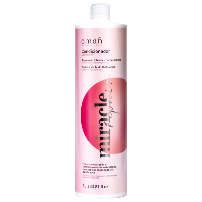 Emáh Hair Care Miracle Repair - Condicionador 1L: com ação reparadora, hidratante e nutritiva, seus componentes promovem redução da porosidade dos fios. Sua fórmula permite com que a umidade das fibras capilares sejam retidas, mantendo brilho, maciez e sedosidade por mais tempo.
