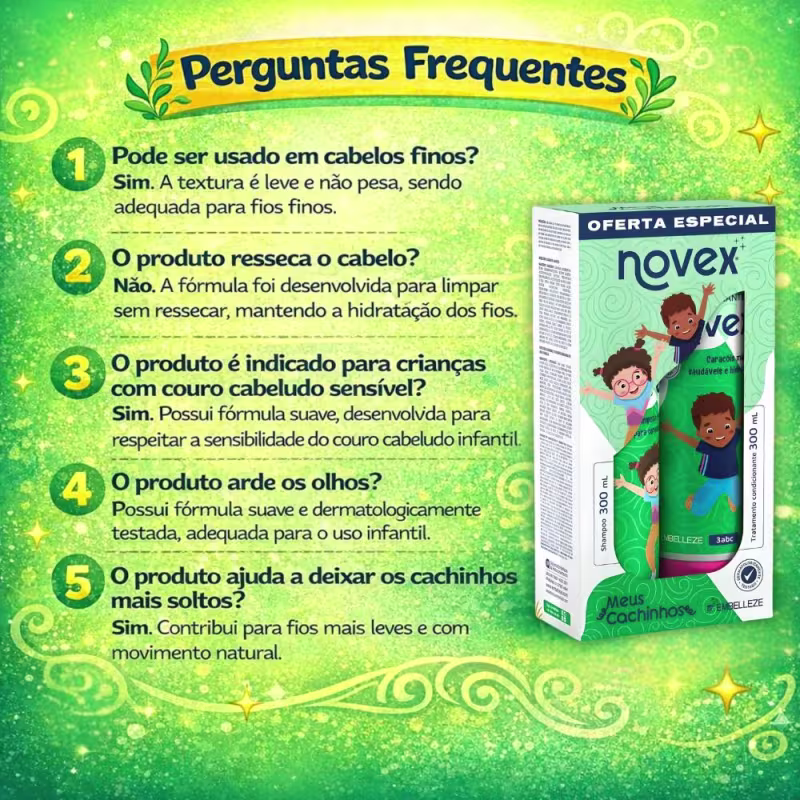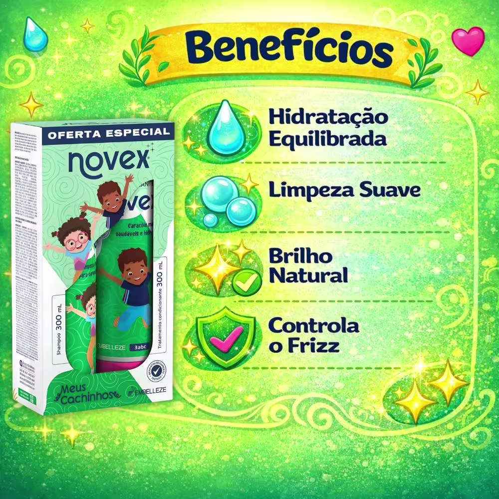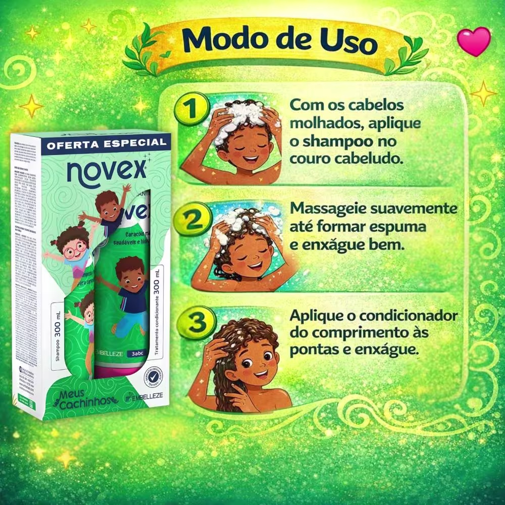 Não sei o CEPKit com shampoo e condicionador para cabelos cacheados, uso a partir dos 3 anos. Embelleze Novex Meus Cachinhos proporciona hidratação, vitalidade, maciez e brilho.