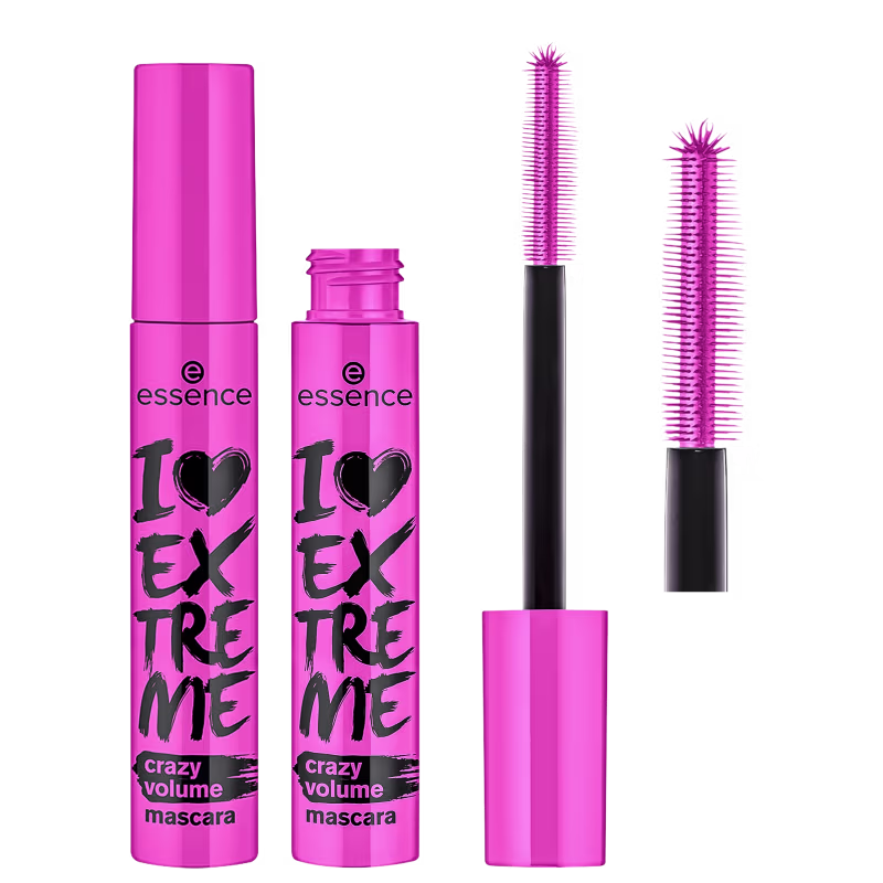 Kit com máscaras de cílios na cor preta. Essence I Love Extreme Crazy Volume proporciona muito mais volume para criar um visual extremamente dramático.