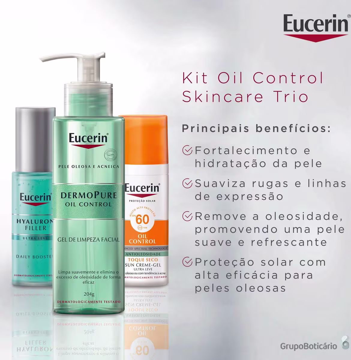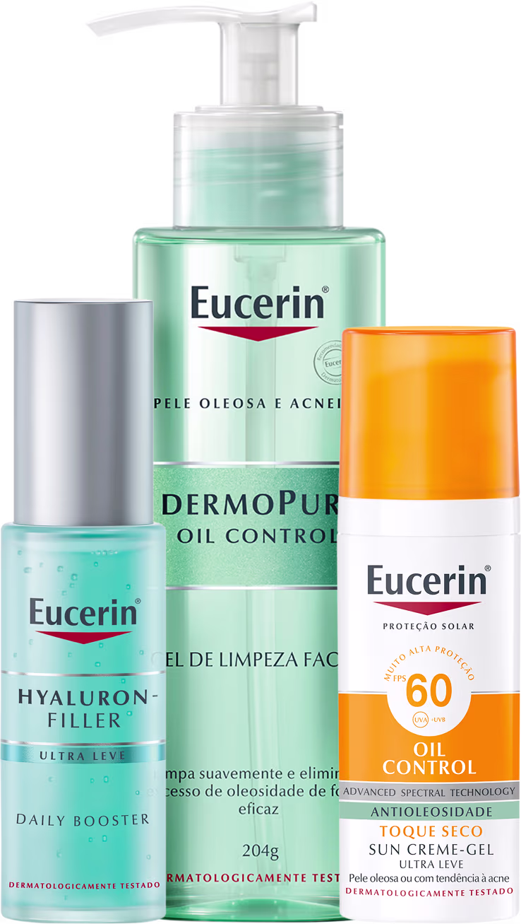 O Kit Eucerin Oil Control Skincare Trio é ideal para o cuidado da pele oleosa. Traz um gel de limpeza que remove as impurezas e controla a oleosidade; um gel hidratante que hidrata ao mesmo tempo que oferece ação Redutor de Linhas; e um protetor solar de textura leve, toque seco e efeito matificante de longa duração. Um trio poderoso para cuidar da sua pele diariamente!