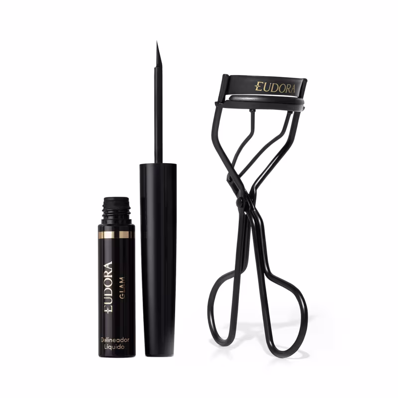 O Kit Eudora Glam Turbo Olhos une o Curvador de Cílios Turbo com o Delineador Líquido Super Preto Eudora Glam para deixar os cílios com curvatura máxima e traço preciso com um delineado à prova d'água que não borra.