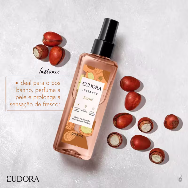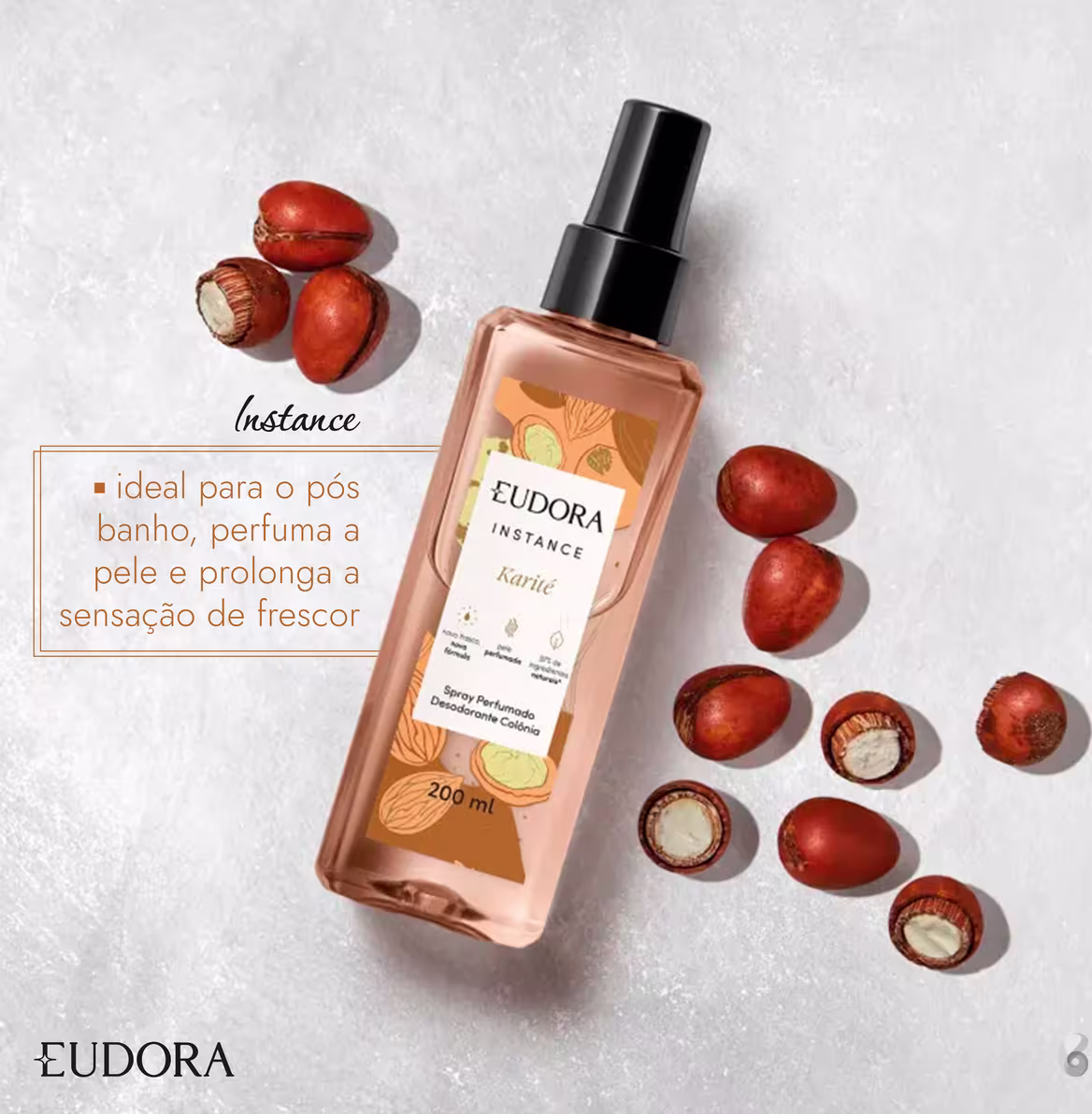 Kit com creme hidratante desodorante corporal e spray perfumado desodorante. Eudora Instance Karité hidrata e perfuma a pele.