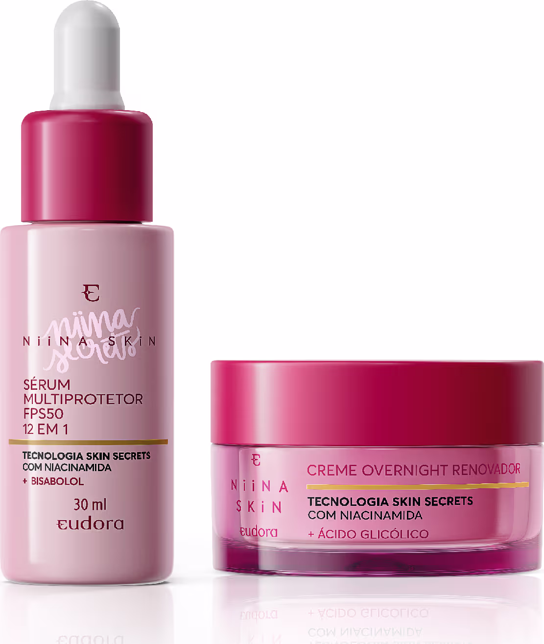 Kit com sérum facial multiprotetor e creme de uso noturno para todos os tipos de pele. Eudora Niina Secrets Skin Dia e Noite é ideal para potencializar a rotina de skincare.