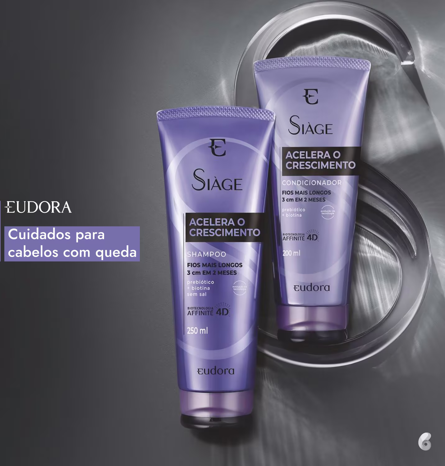 Kit com shampoo e condicionador para cabelos com queda. Eudora Siàge Acelera o Crescimento Duo traz a dupla essencial de cuidados com o seu cabelo.