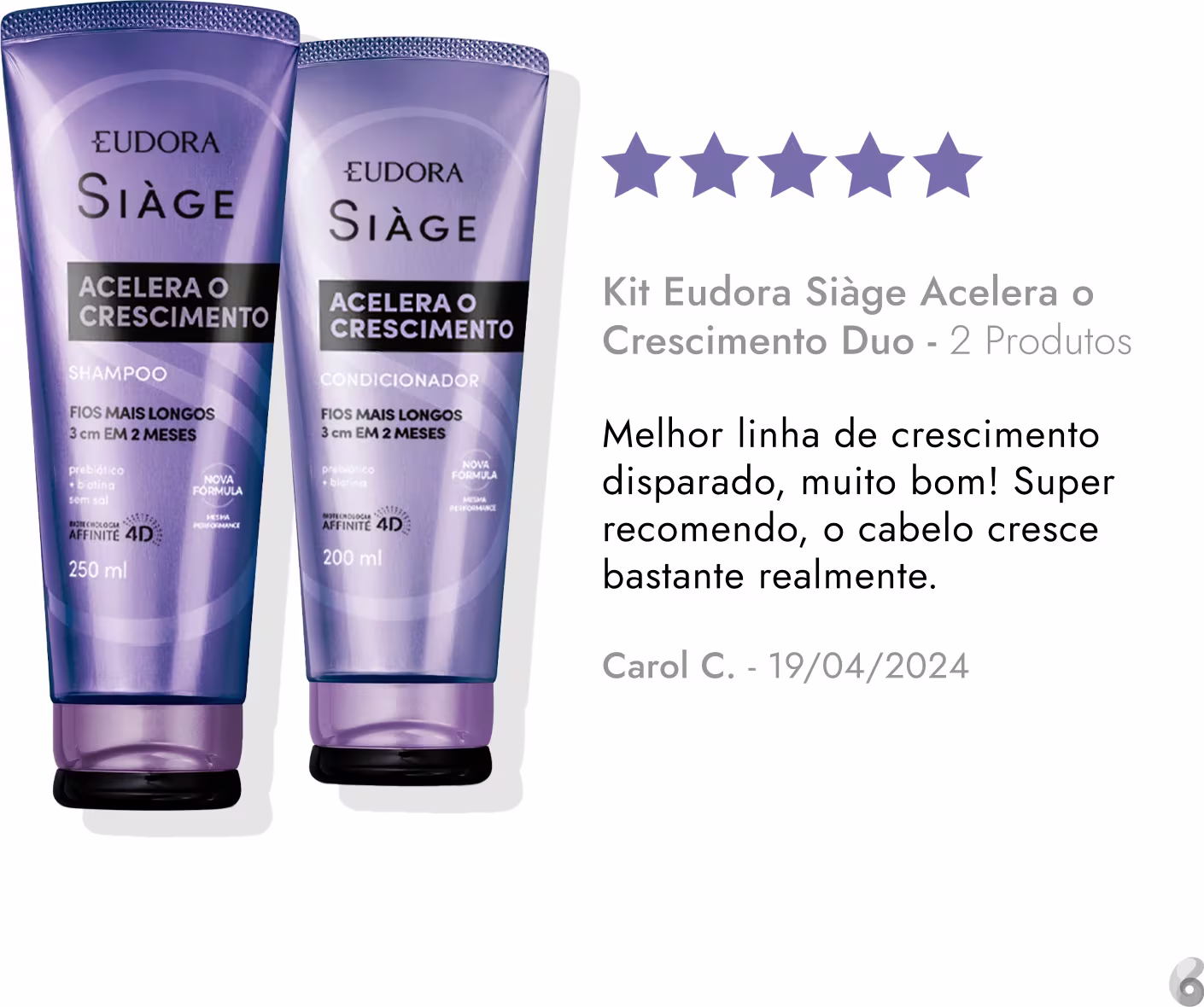 Compre Kit Eudora Siàge Acelera o Crescimento Duo. A dupla de produtos essenciais para garantir os cuidados que seu couro cabeludo merece. Melhores produtos Eudora na BLZ. Ver mais ❯