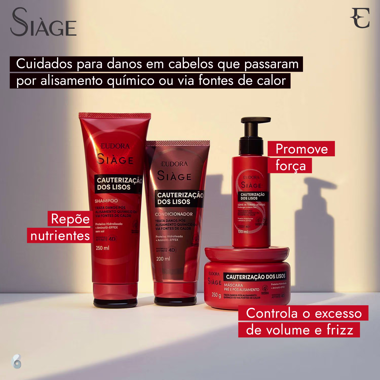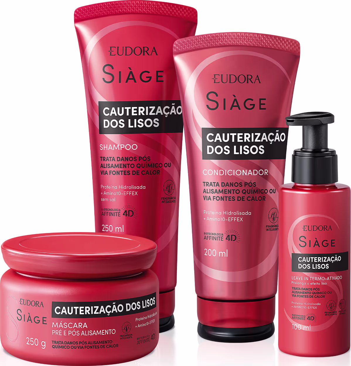 Kit de tratamento para danos em cabelos que passaram por alisamento químico ou via fontes de calor. Eudora Siàge Cauterização dos Lisos possui itens que entregam os melhores cuidados para seus fios alisados.