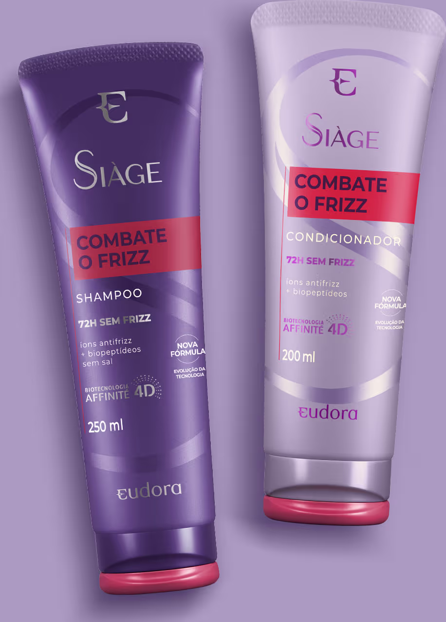 Kit com shampoo e condicionador para cabelos com frizz. Eudora Siàge Combate o Frizz Duo tem tudo o que você precisa para deixar os seus cabelos alinhados, disciplinados e com menos frizz por até 72 horas.