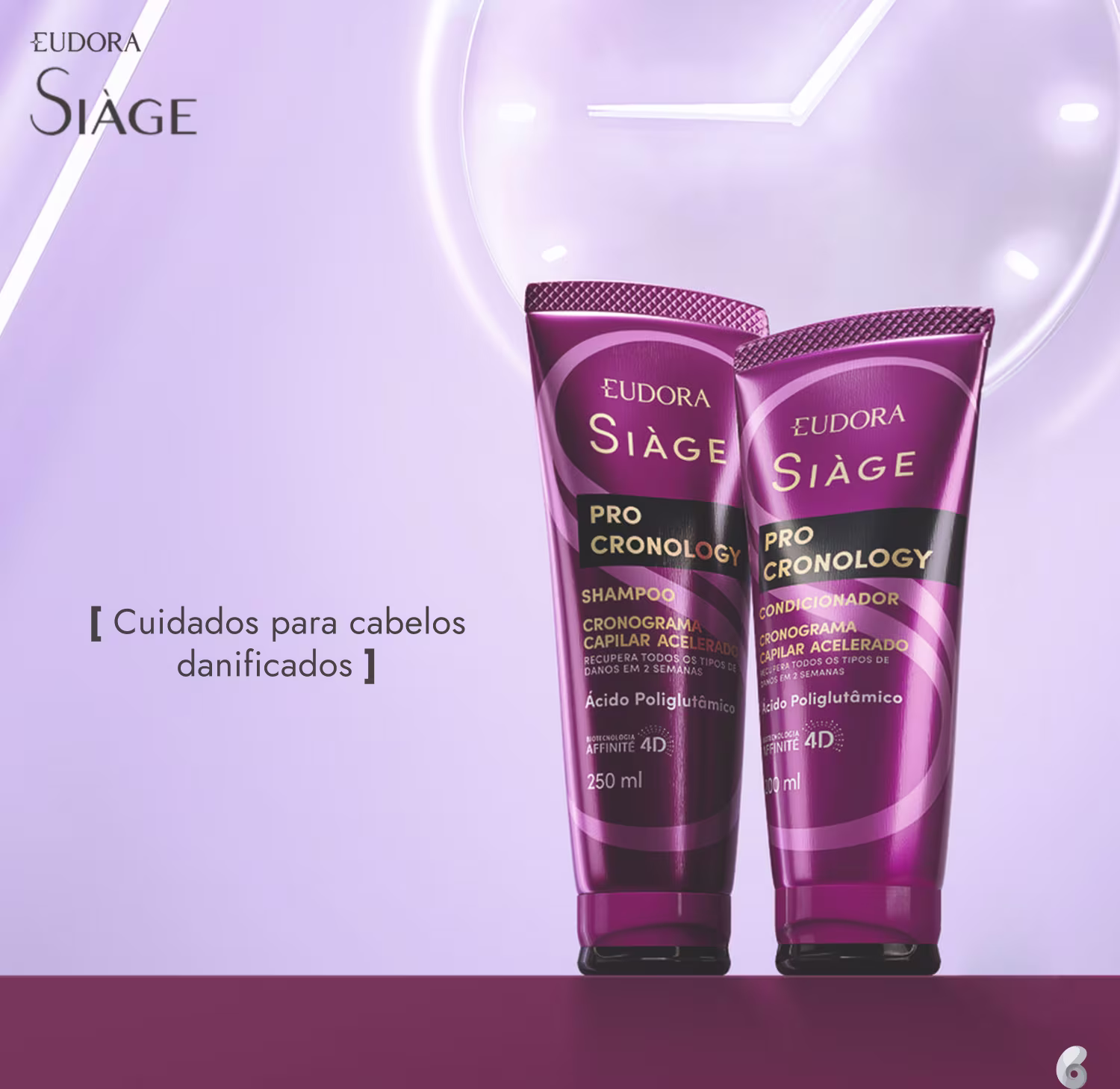 Eudora Siàge Pro Cronology traz o cronograma capilar acelerado capaz de recuperar todos os tipos de danos em 2 semanas. A linha pausa a degradação e o desgaste do fio e recupera os danos mais severos em todos os tipos de cabelo. Toda a linha possui fórmulas enriquecidas com Ácido Poliglutâmico: ativo biotecnológico que auxilia no equilíbrio da umidade natural interna e externa dos fios, garantindo maciez, brilho e alta hidratação dos cabelos.