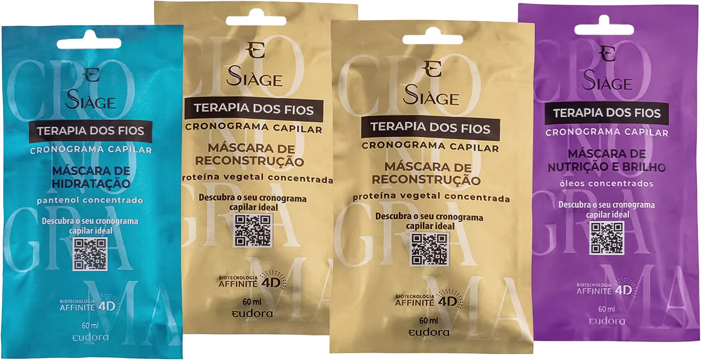 Kit com 4 máscaras capilares em formato sachê. Eudora Siàge Terapia dos Fios Cronograma Capilar + Reconstrução traz uma rotina que favorece os cabelos que precisam de reconstrução intensa.