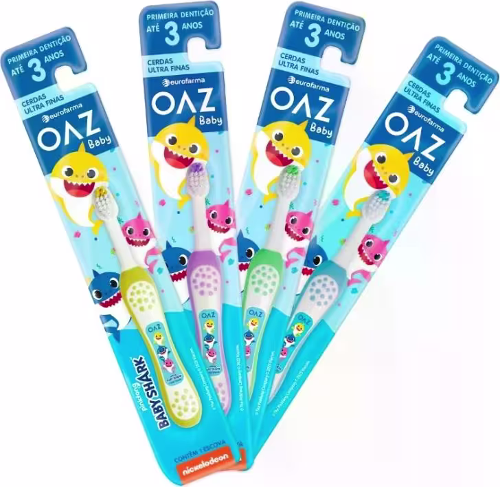 Não sei o CEPKit com escovas de dentes para crianças de 0 a 3 anos. Eurofarma Display OAZ Baby Shark Escova de Dentes conta com cabeça compacta e cerdas niveladas.