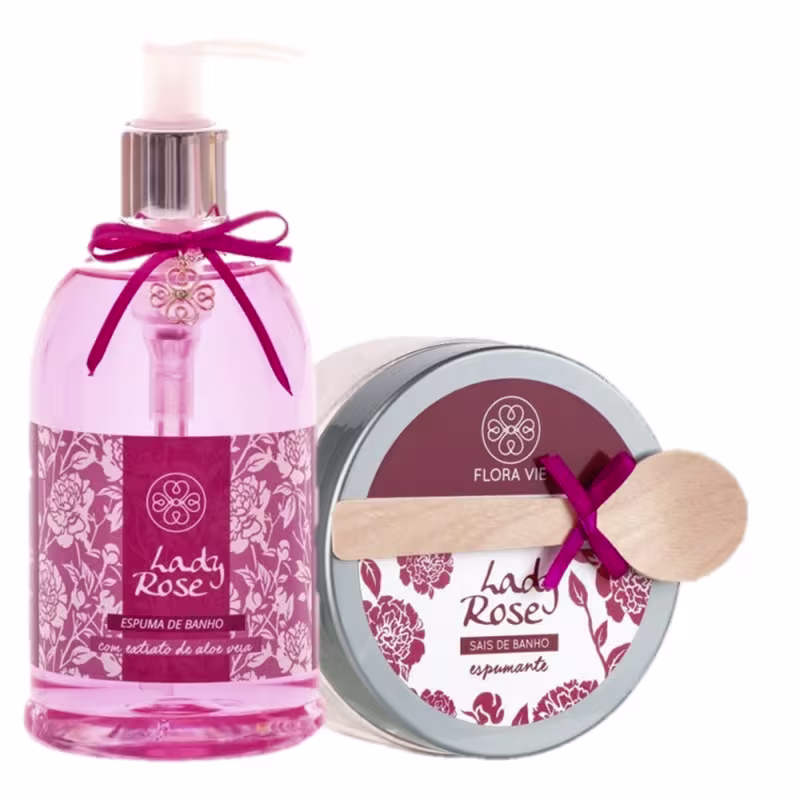 Kit com espuma e sais de banho. Flora Vie Lady Rose Banho Relaxante transforma o seu banho em um ritual de beleza e autocuidado.