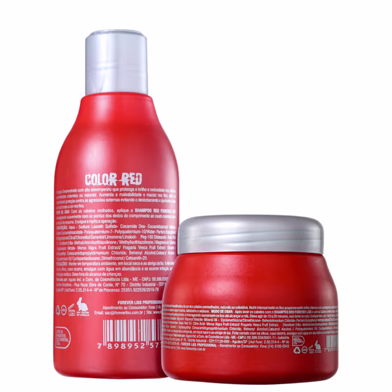 Kit Forever Liss Professional Color Red Duo nutre a fibra capilar e proporciona brilho extremo, além de proteger a integridade dos pigmentos vermelhos por muito mais tempo. O kit ainda aumenta a maleabilidade e a maciez dos fios enquanto limpa suavemente, sem comprometer a coloração. Conquiste cabelos vermelhos, radiantes e incrivelmente saudáveis!