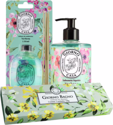 O Kit Giorno Flor de Verbena conta com um sabonete líquido para mãos e corpo, com uma saída explosiva adocicada. Três sabonetes em barra com perfumes delicados e formulação suave, que proporcionam uma agradável maciez e hidratação da pele e um difusor de ambientes elaborado com fragrâncias adocicadas.