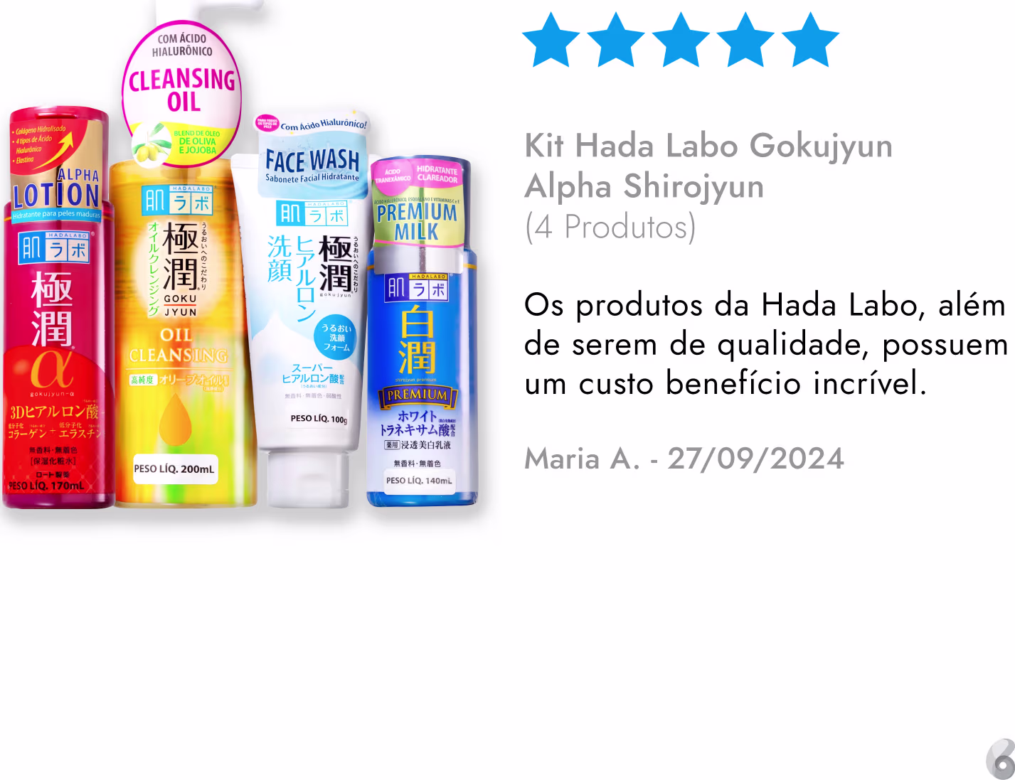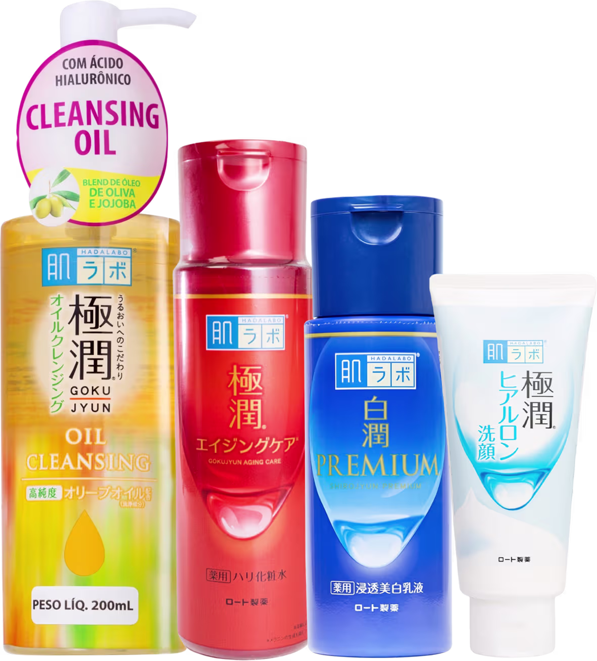Kit facial com sabonete, óleo de limpeza, loção Redutor de Linhas e hidratante Uniformizador. Hada Labo Gokujyun Alpha Shirojyun para uma aparência mais jovem e uniforme.