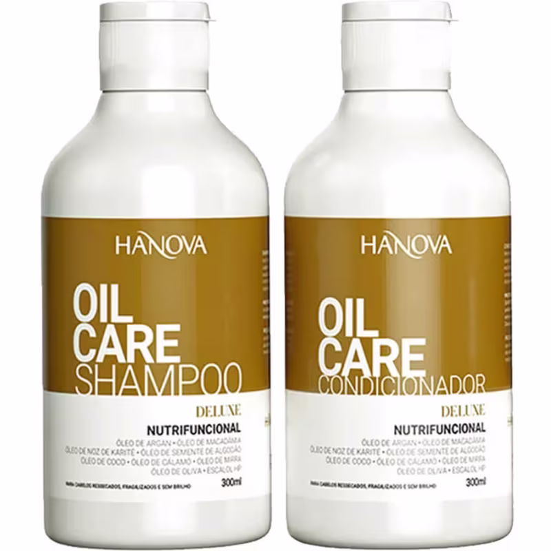 Kit com shampoo e condicionador. Kit Hanova Oil Care Deluxe recupera a saúde dos fios, trazendo maciez e brilho. Com esse combo, você vai conseguir cabelos cada dia mais brilhantes, suaves, fortes e com um perfume incrível. Prepare-se para ter madeixas soltinhas, com maleabilidade e resistência.