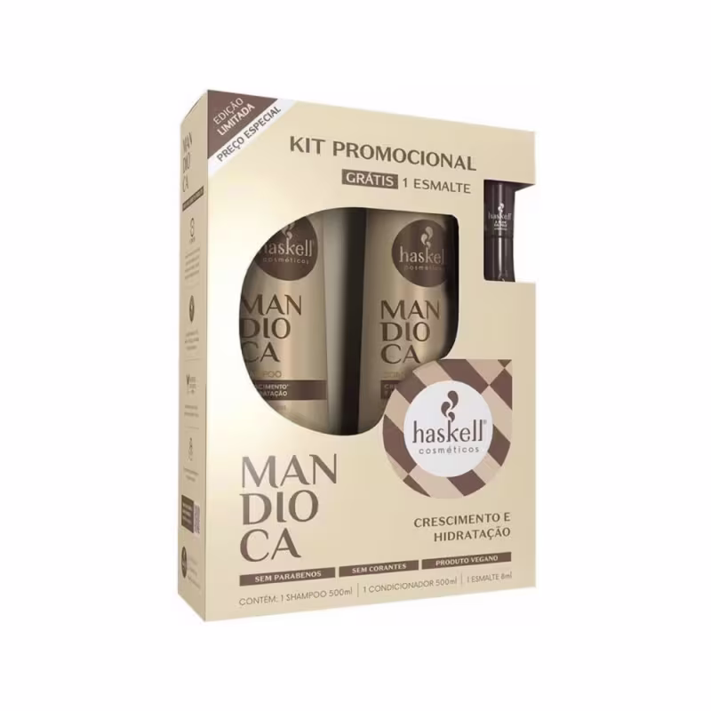 O Kit Haskell Mandioca Crescimento e Hidratação traz fórmulas que hidratam, condicionam e selam as cutículas do cabelo, o que permite madeixas mais belas e cheias de vida. Para completar, acompanha um belíssimos esmalte para realçar suas unhas!