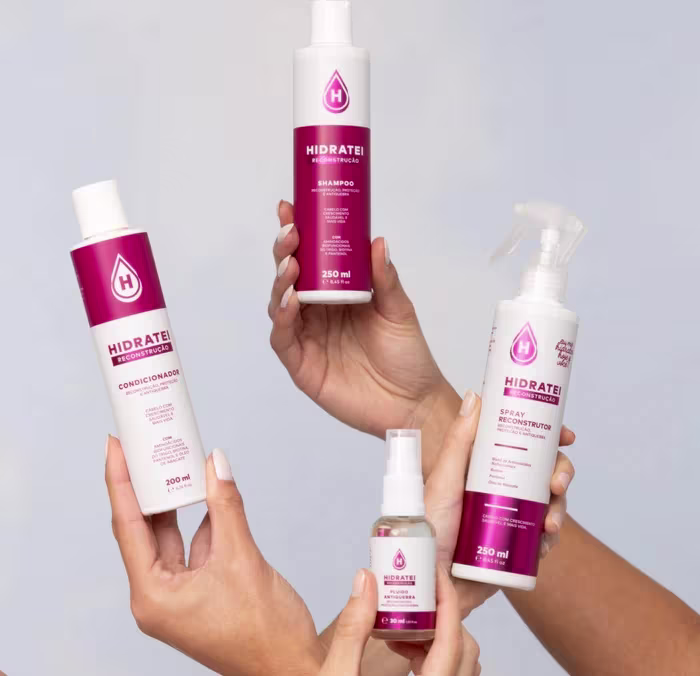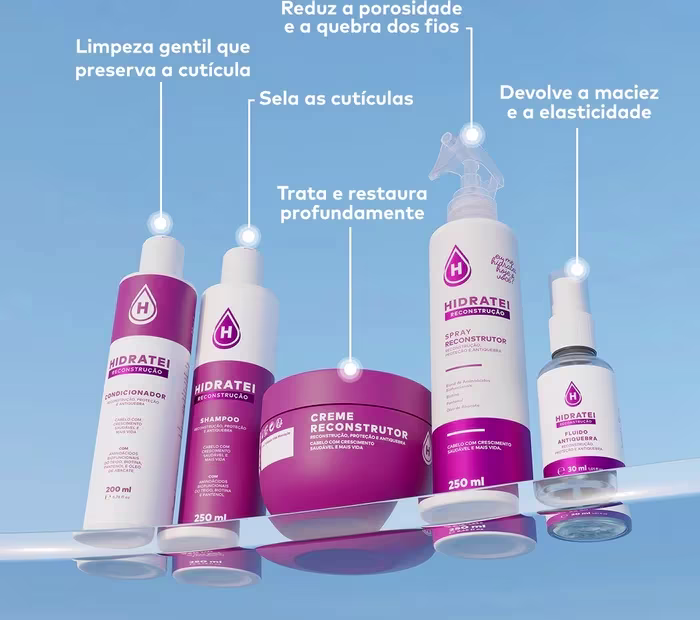 Hidratei Reconstrução - Shampoo 250ml: limpa gentilmente enquanto preserva a cutícula capilar, ajudando na recuperação dos fios e promovendo um crescimento saudável.
