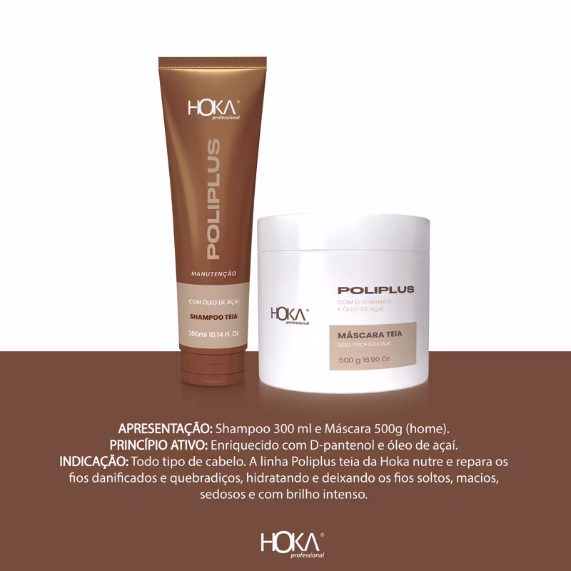 Hoka Professional Poliplus - Shampoo 300ml: limpa suavemente os fios, enquanto repõe os nutrientes necessários para as fibras capilares, deixando-as saudáveis, macias e repletas de brilho.