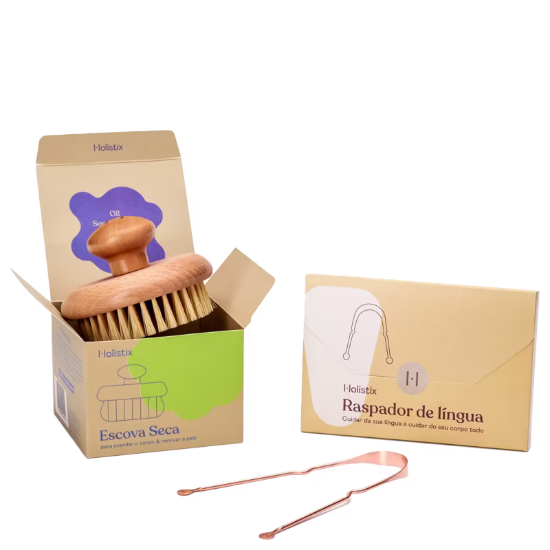 Kit com raspador de língua e escova seca. Holistix Raspador de Língua e Escova Seca conta com produtos simples para hábitos saudáveis dos dia a dia.
