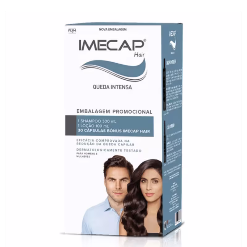 Kit com 30 capsulas, shampoo e loção. O Kit Imecap Hair Queda Intensa ajuda a nutrir e densificar cabelos enfraquecidos evitando a queda.