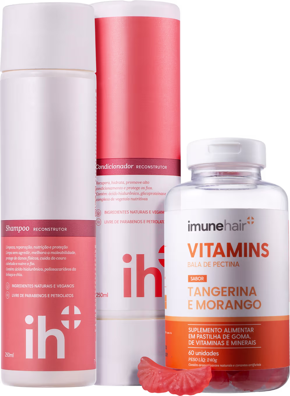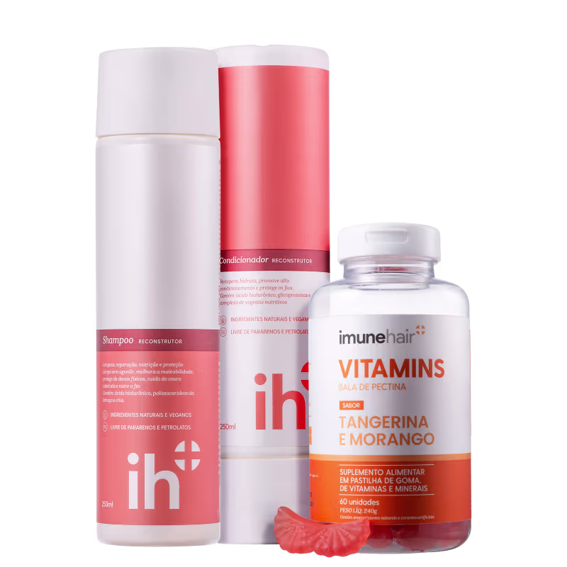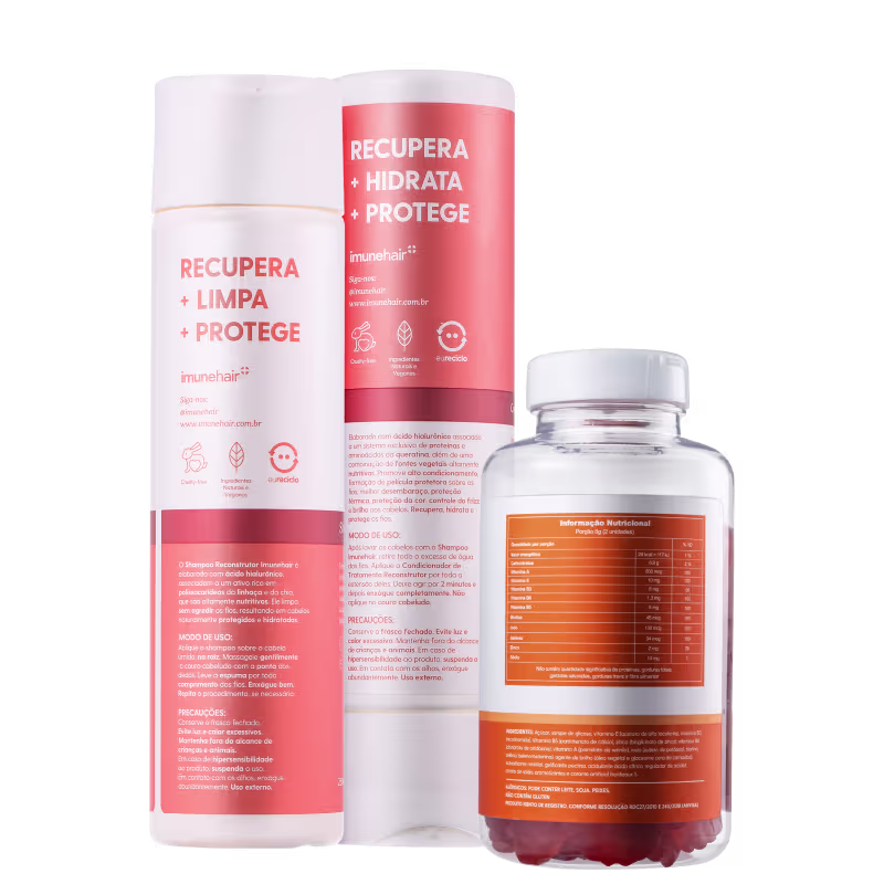 Kit com shampoo, condicionador e suplemento alimentar. Imunehair Reconstrutor Vitamins ajuda a cuidar da saúde dos fios, além de tratar a pele e unhas.