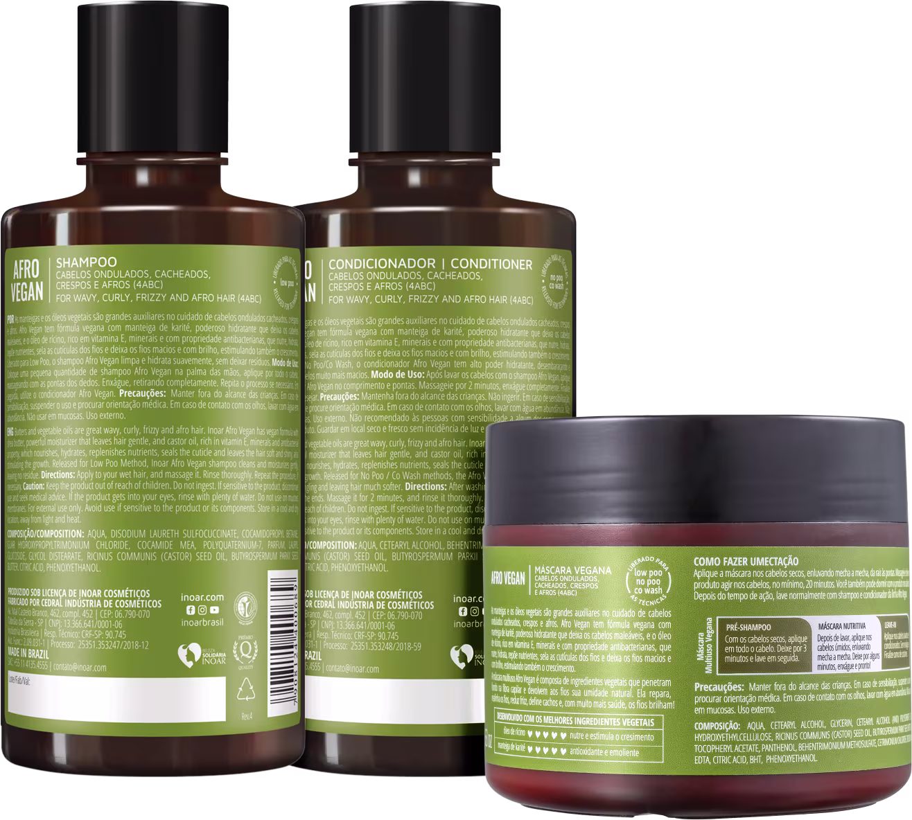 Kit Inoar Afro Vegan Trio atua na reposição de nutrientes indispensáveis enquanto ajuda na definição, sela as cutículas e ainda estimula o crescimento saudável dos fios, com muito brilho e maciez. Ou seja, mostra a verdadeira forma e beleza do cabelo crespo.
