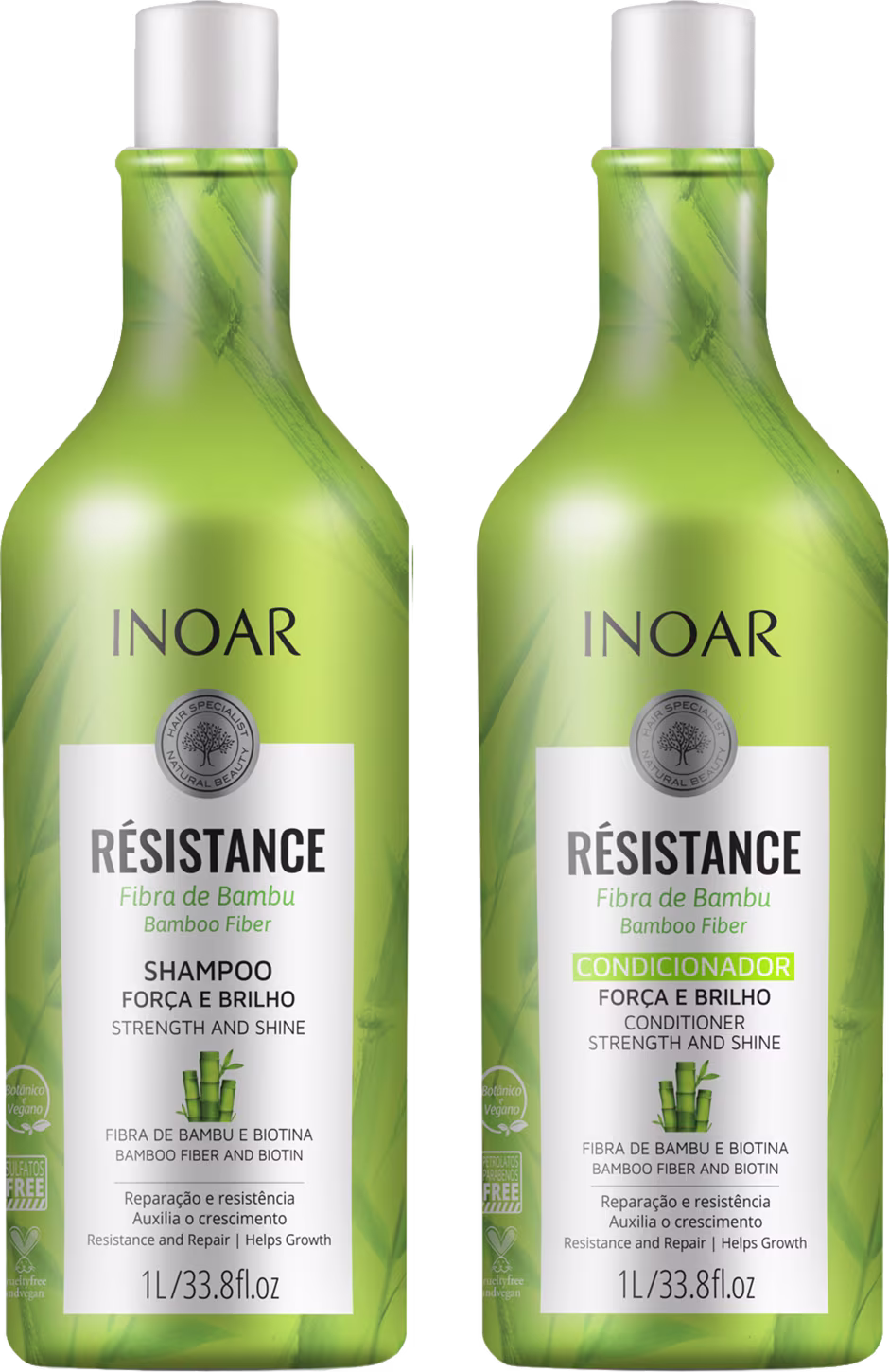 Kit para cabelos enfraquecidos em tamanho profissional. Kit Inoar Résistance Fibra de Bambu Salon Duo fortalece e melhora o brilho dos fios, além de ajudar no crescimento saudável.