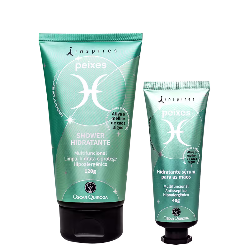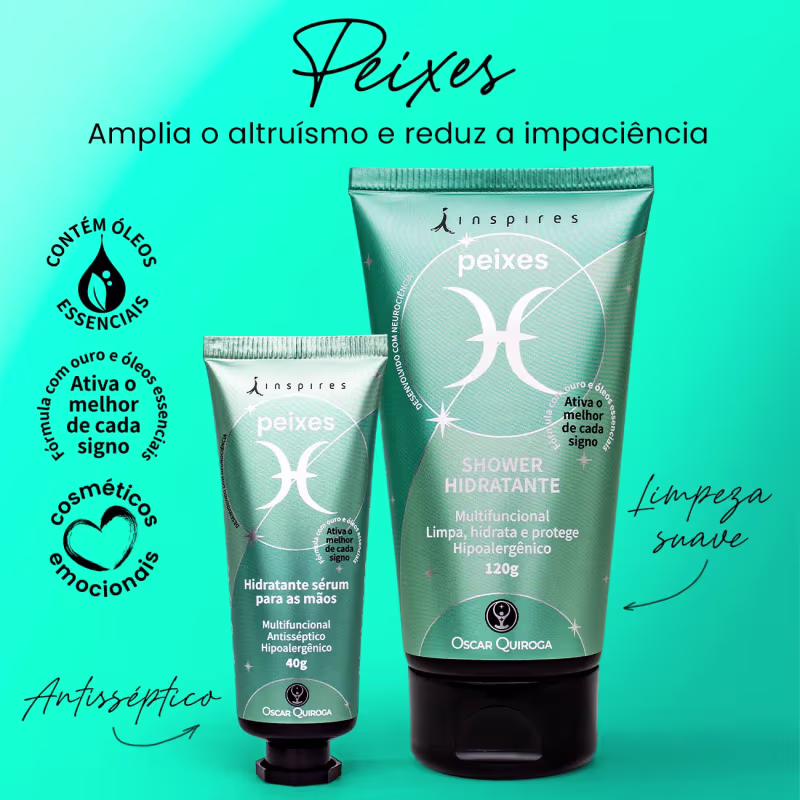 Kit com shower hidratante corporal e hidratante sérum para as mãos. Inspires Oscar Quiroga Astros Peixes que amplia o altruísmo e reduz a impaciência. Cosméticos emocionais com ação multifuncional e fórmula exclusiva com óleos essenciais que proporcionam uma pele super hidratada e ativa o melhor de cada signo.