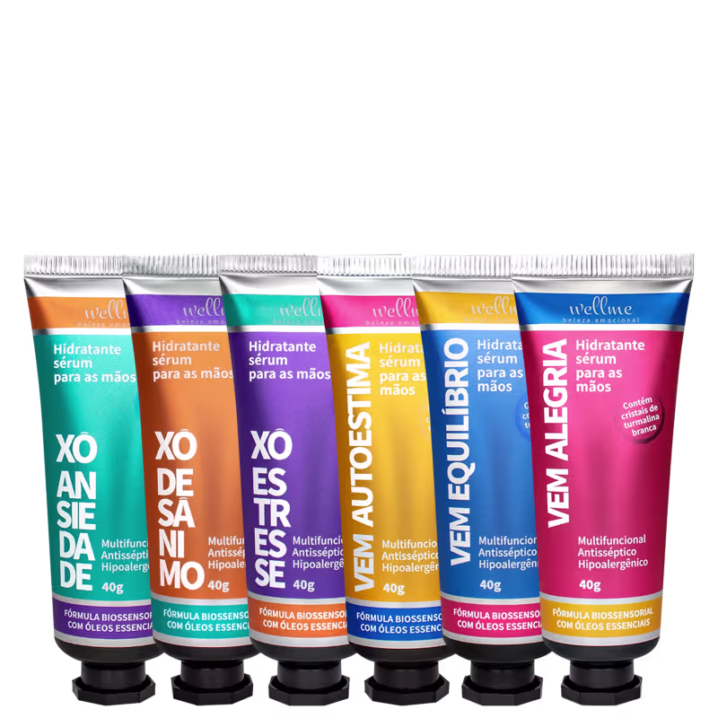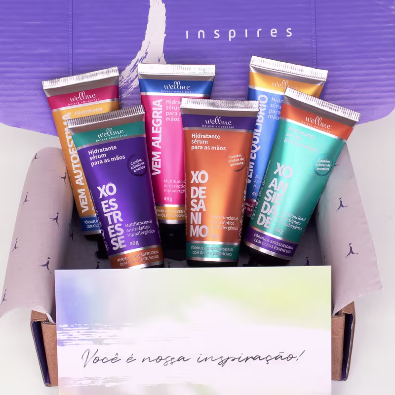 O Kit Inspires Wellme Caixinha das Emoções são hidratantes sérum para as mãos da linha Vem e Xô são cosméticos emocionais com ação multifuncional: que cuidam da sua pele e também das suas emoções!