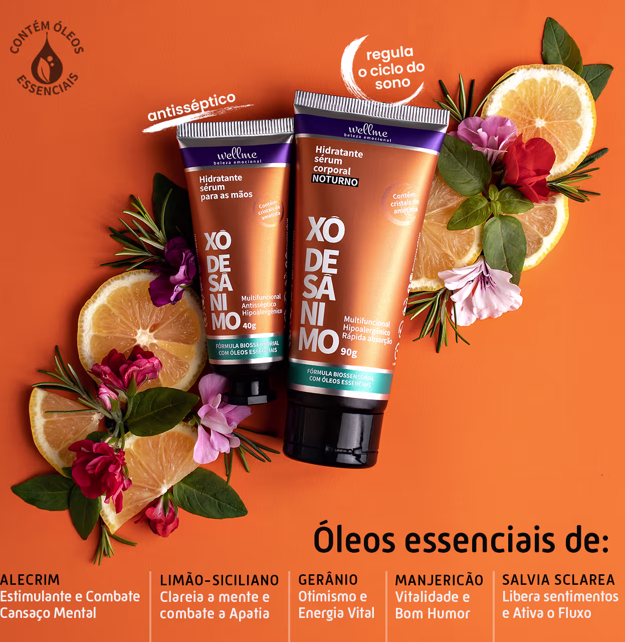 Kit com hidratante sérum corporal noturno e hidrante sérum para as mãos. Inspires Wellme Dupla Xô Desânimo hidratam profundamente a sua pele e ajudam a equilibrar as emoções. Cosméticos emocionais com ação multifuncional e fórmula exclusiva com óleos essenciais e neurociência.