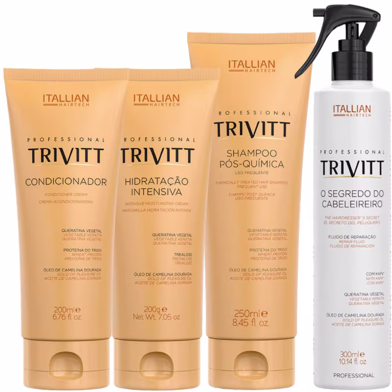 Kit de tratamento para cabelos quimicamente tratados. Itallian Hairtech Squad Trivitt Reconstrutor Cabelos Pós Química traz uma hidratação e reconstrução potente.
