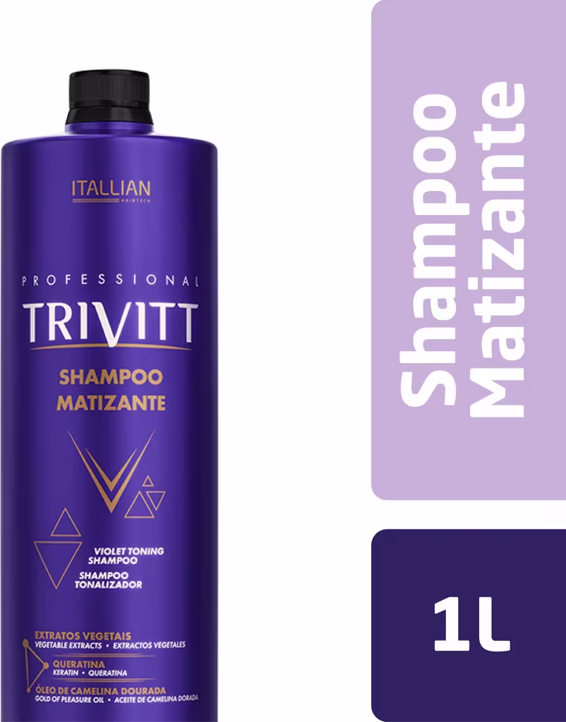 Itallian Trivitt Matizante - Shampoo 1L: possui uma fórmula única com ativos que conservam o tom loiro luminoso e acinzentado, protegendo os fios das agressões que causam a oxidação do pigmento no interior das fibras capilares. Além disso, previne o surgimento de manchas indesejadas nos cabelos.