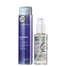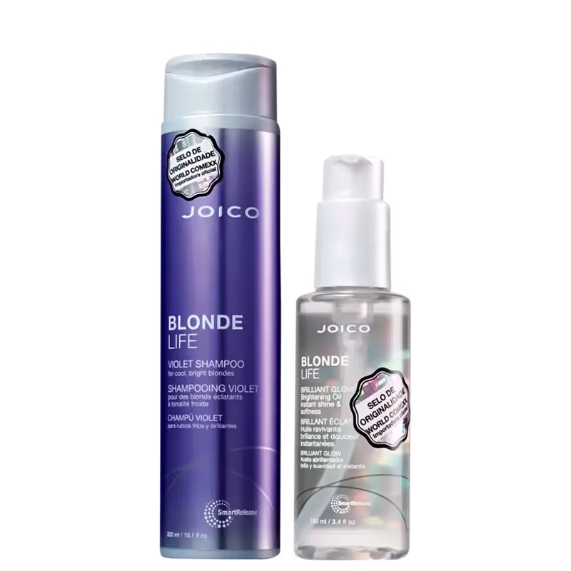 Kit com shampoo matizante e óleo para cabelos loiros. Joico Blonde Life Matizante limpa e nutre os fios, neutralizando o amarelado e oferecendo um loiro radiante, com um fundo mais frio, sem perder o brilho.