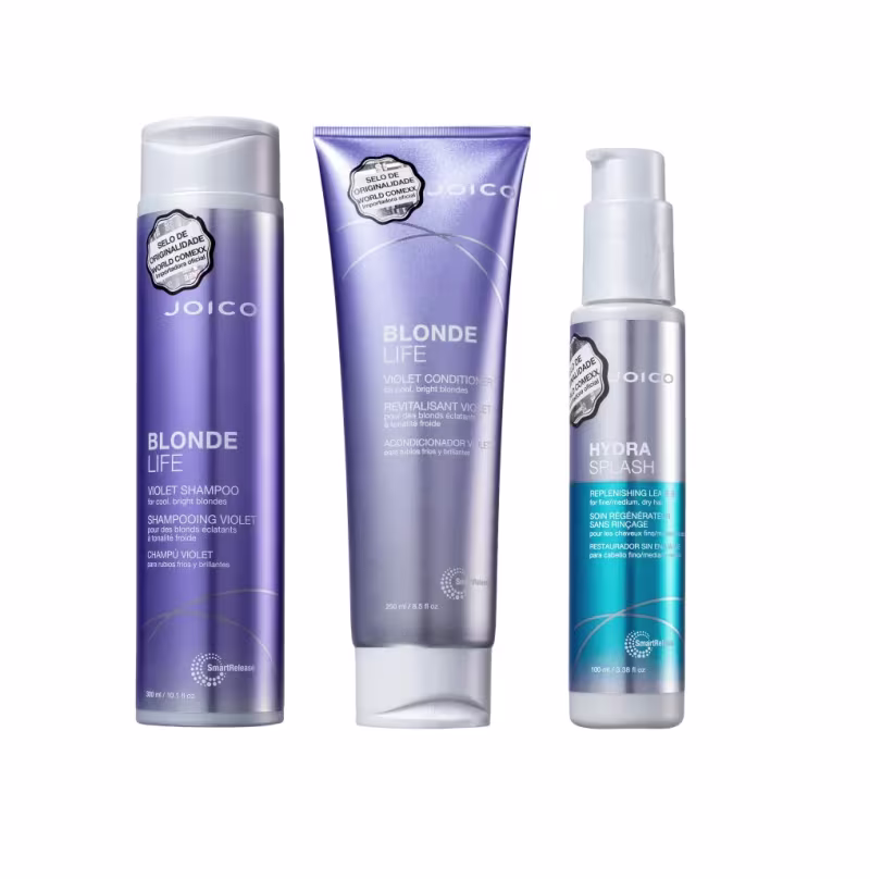Kit com shampoo, condicionador e leave-in. Joico Blonde Life Violet Smart Release Replenishing tem fórmula enriquecida que fortalece e protege as mechas.