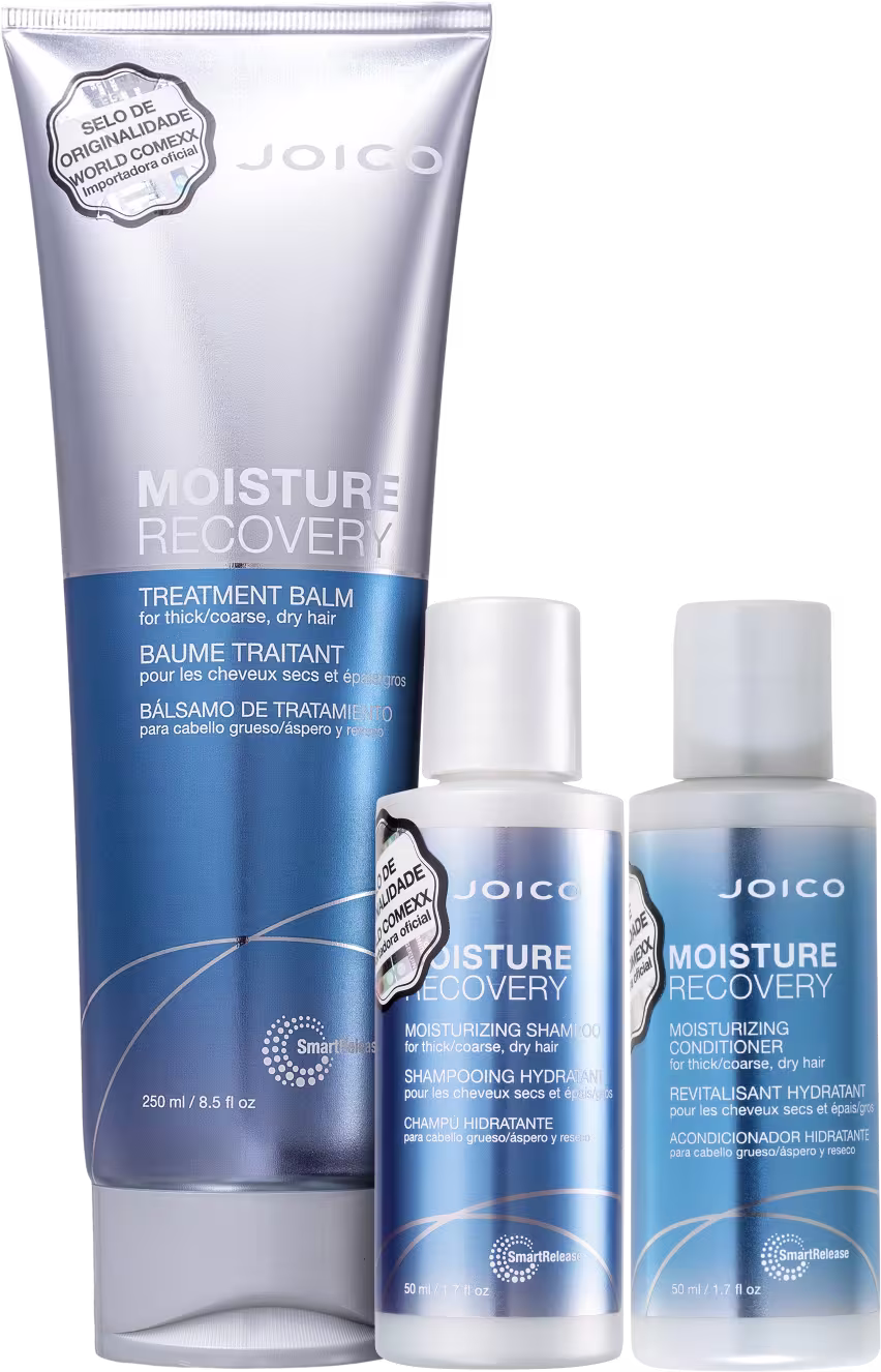Kit com shampoo e condicionador em miniatura + máscara full size para fios secos ou ressecados. Kit Joico Moisture Recovery Meu Trio Favorito trata desde a raiz até as pontas, além de minimizar o frizz.