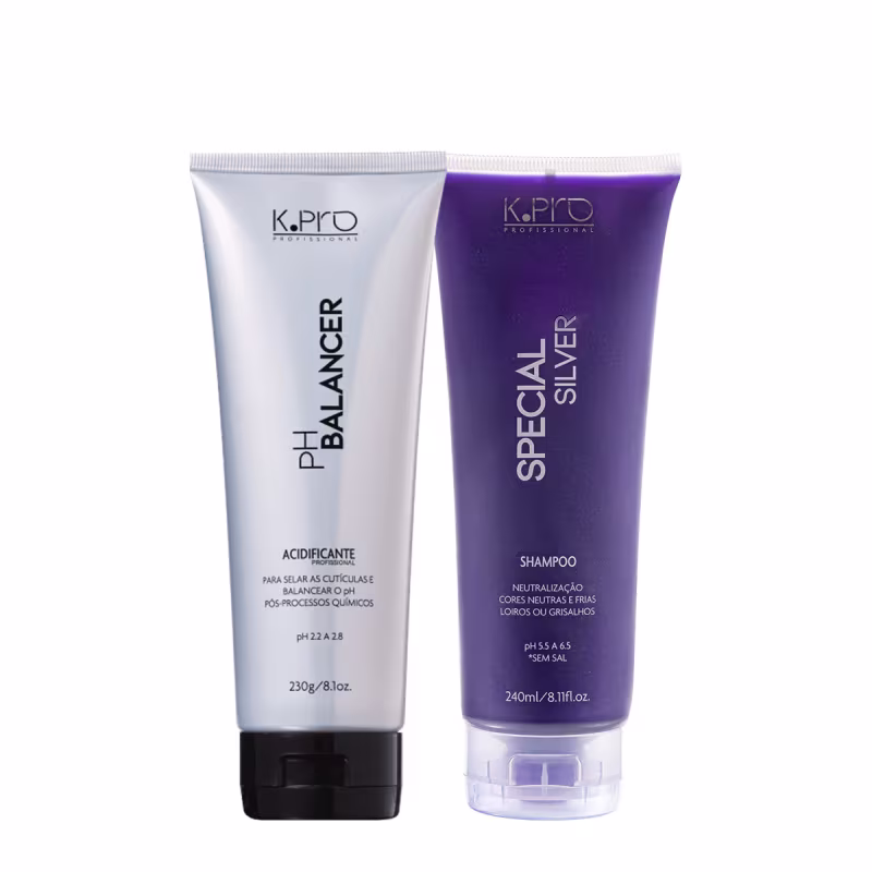 Kit com shampoo e acidificante para cabelos loiros. K. Pro Special Silver pH Balancer garante fios deslumbrantes e saudáveis.