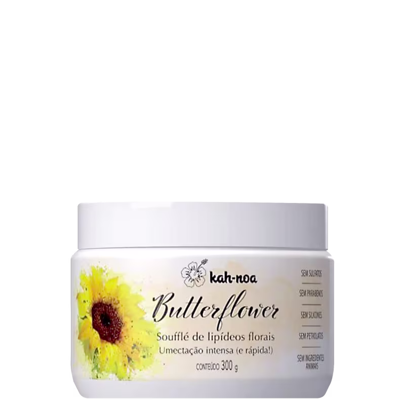 Kah-Noa Butterflower - Máscara Capilar Umectante 300g: é um Souflé de Lipídeos Girassol, Rosa Mosqueta, Macadâmia e Cera de Candelila, suficientes para revestir o fio com uma película delicada de umectantes naturais e reter a umidade (ah, e ainda dão aquele brilho!).
