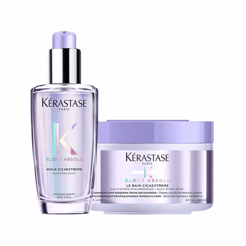 Kit com shampoo e óleo para cabelos danificados. Kérastase Blond Absolu Cicaextreme Duplo promove nutrição profunda, reconstrução e brilho intenso aos fios.