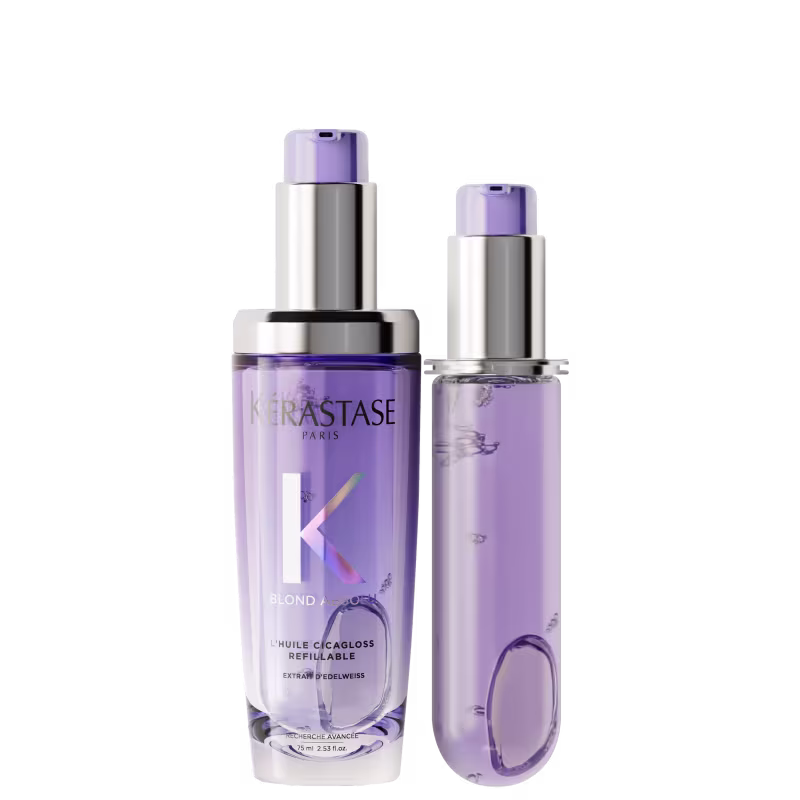 Kit com óleo para cabelos loiros, descoloridos ou com mechas. Kérastase Blond Absolu L'Huile Cicagloss Double proporciona hidratação, fortalecimento e brilho instantâneo.