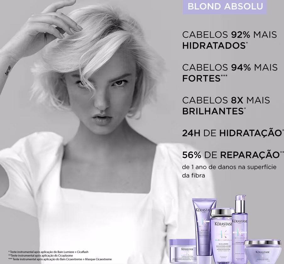 Ritual de cuidados diários para todos os tipos de loiros. Kérastase Blond Absolu fortalece a fibra, mantém a cor impecável e luminosa. Para fios loiros no estilo que você quiser, sempre lindos e saudáveis.