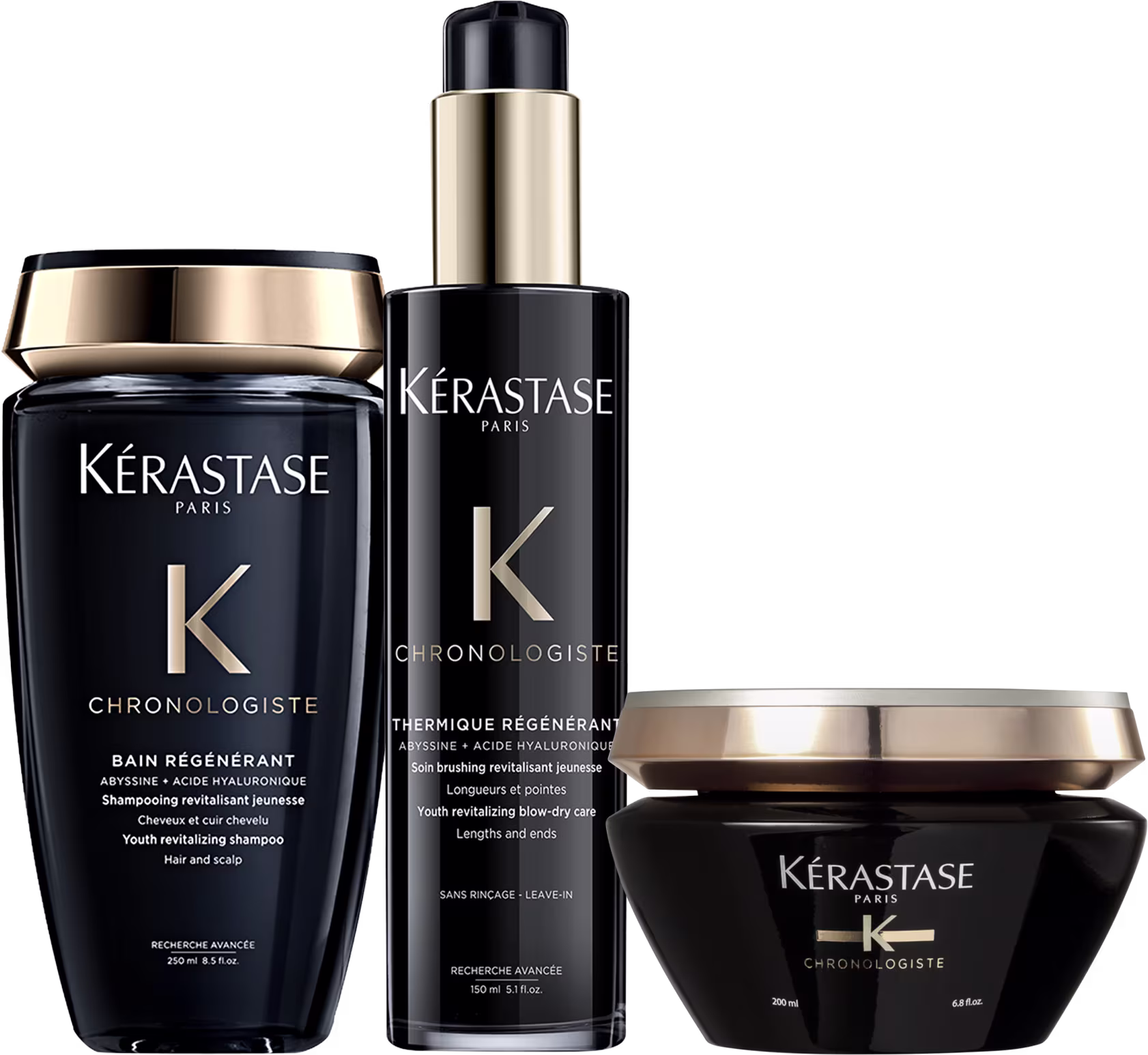 Kit de tratamento regenerativo para cabelos grossos e danificados. Kérastase Chronologiste #1 é um tratamento do couro cabeludo e dos fios profundo, que garante limpeza, nutrição e hidratação, além de controlar o frizz.