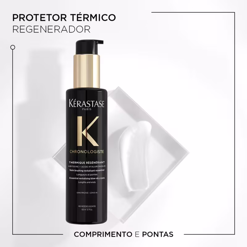 Kérastase Chronologiste Thermique Régénérant - Leave-in 150ml: fórmula em creme, enriquecida com Ácido Hialurônico, Abyssine e Vitamina E, que ajuda a regenerar a fibra capilar e combater os sinais de envelhecimento do cabelo.