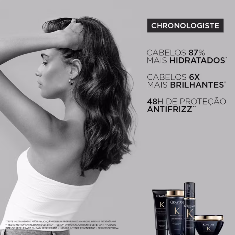 Kérastase Chronologiste Masque Intense Régénérant - Máscara Capilar 200ml: especialmente desenvolvida para regenerar os fios por completo, já que pode ser aplicada desde a raiz até as pontas, ajudando a deixar os cabelos até 87% mais hidratados, com luminosidade intensa, textura aveludada e balanço ímpar.