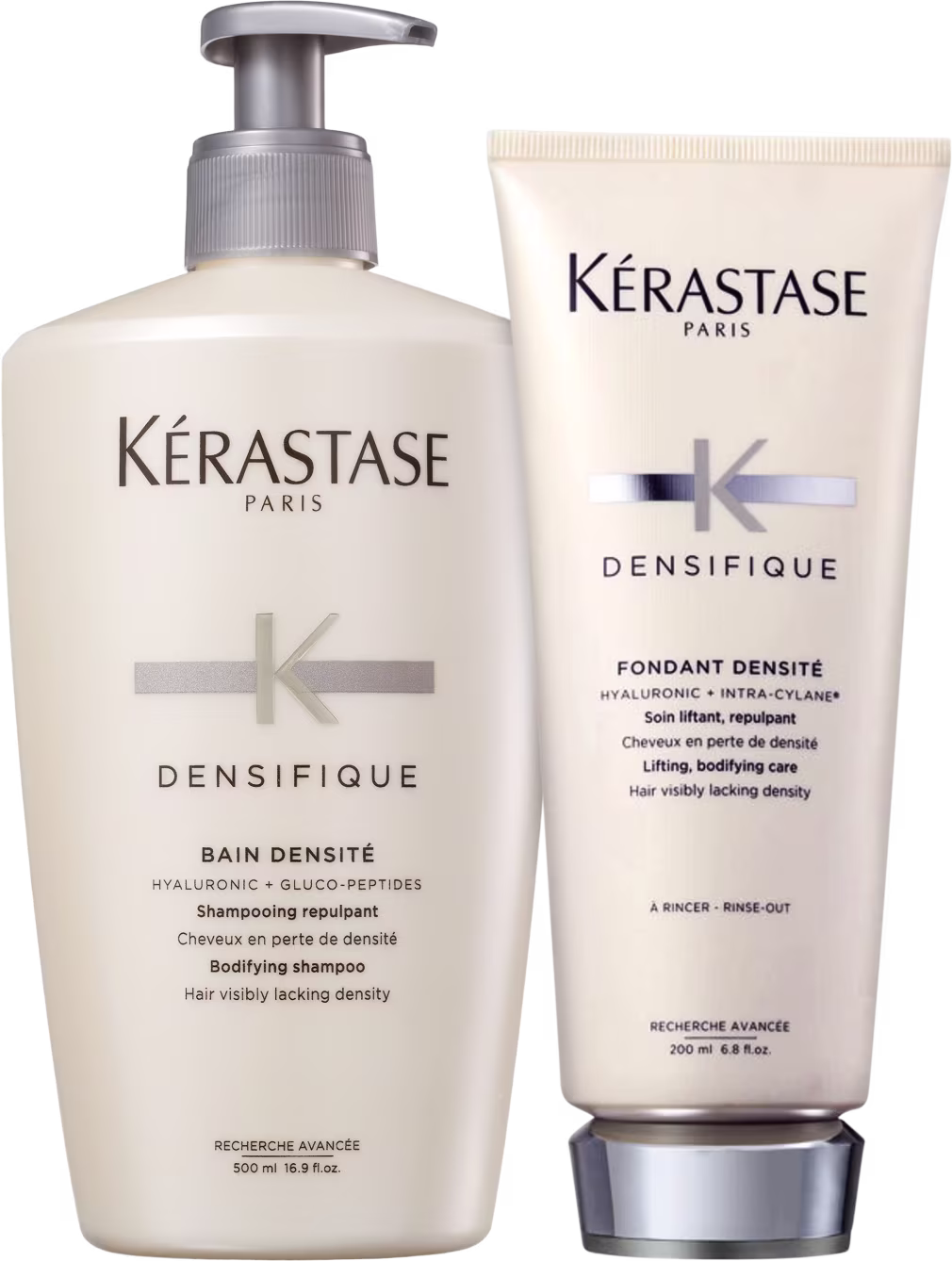Kit com shampoo e condicionador para cabelos ralos. Kérastase Densifique Fondant Densité limpa, dá mais textura, corpo e resistência aos fios.