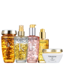 Kit com shampoo, máscara e óleos capilares. Kérastase Elixir Ultime Cinque confere brilho aos cabelos ressecados e opacos.