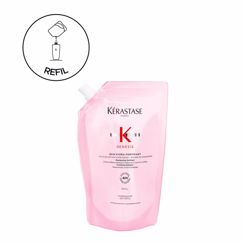 Kit com shampoo e refil para cabelos finos propensos à queda. Kérastase Genesis Power Refil Duo purifica os fios, enquanto fortalece e nutre.