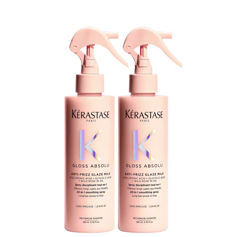 Não sei o CEPKit com leave-ins em spray para todos os tipos de cabelo. Kérastase Gloss Absolu Leave-in Double confere brilho e efeito antifrizz.