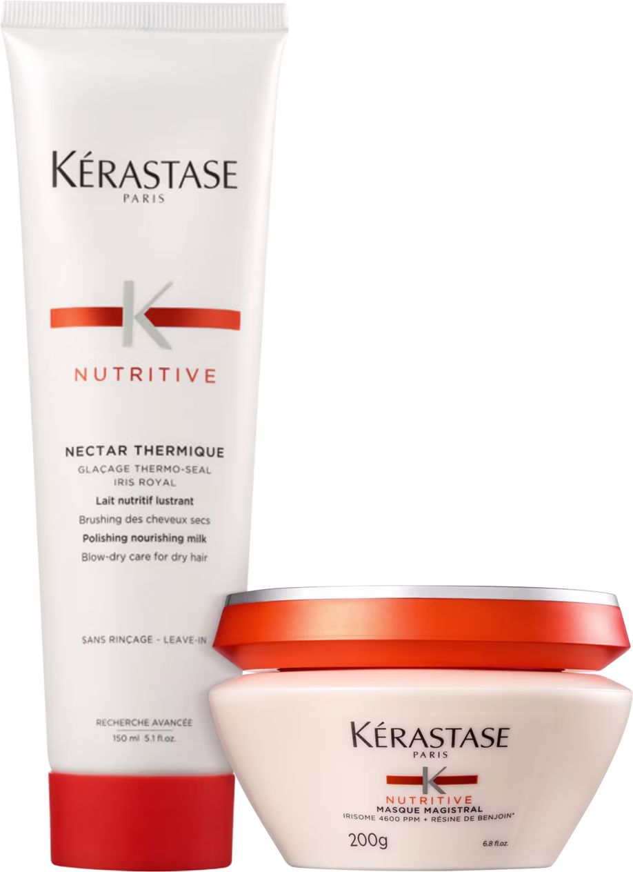 Kit com máscara de nutrição e leave-in para cabelos ressecados. Kérastase Nutritive Duo Nectar Thermique nutre e protege das altas temperaturas.