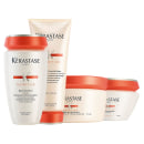 Kit com shampoo, condicionador e 2 máscaras para cabelos ressecados. Kérastase Nutritive Protocole Quarteto nutre intensamente os fios, desde seu interior.
