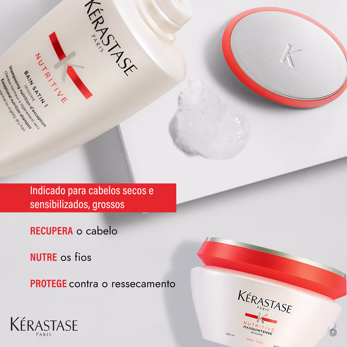 Ritual de nutrição completa para cabelos secos e sensibilizados, grossos. Kit Kérastase Nutritive Satin Cabelos Grossos nutre intensamente e protege do ressecamento, sem pesar.